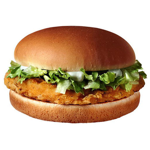 Чикенбург - панированная куриная котлета на булочке с кунжутом, заправленной свежим салатом и соусом