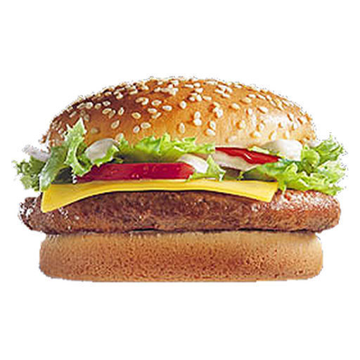 Чизбурег S - большой рубленый бифштекс из натуральной 100%-й говядины с кусочком сыра Чеддер на булочке с кунжутом, заправленной горчицей, кетчупом, луком, двумя кусочками маринованного огурца, свежим салатом, ломтиком помидора и майонеза.