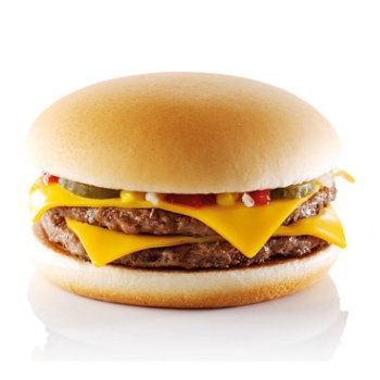 Двойной Чизбургер - два рубленных бифштекса из натуральной 100%-й говядины с двумя кусочками сыра Чеддер на булочке, заправленной горчицей, кетчупом, луком и кусочками маринованного огурца.