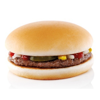 Гамбургер - Рубленый бифштекс из натуральной 100%-й говядины на булочке, заправленной горчицей, кетчупом, луком и кусочком маринованного огурца.